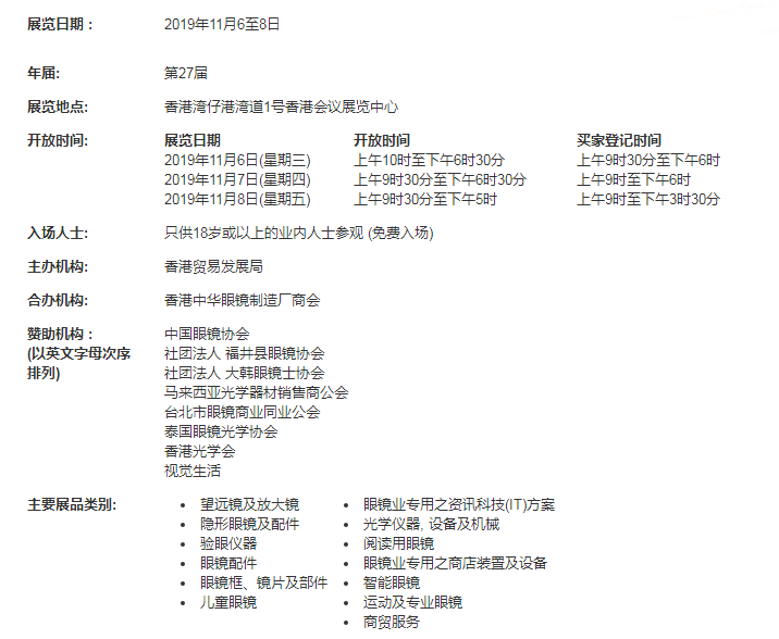 第27屆香港貿(mào)發(fā)局香港國(guó)際眼鏡展呈獻(xiàn)無與倫比的優(yōu)質(zhì)商貿(mào)平臺(tái), 讓參展商與環(huán)球買家建立聯(lián)系。2018年眼鏡展吸引來自111個(gè)國(guó)家及地區(qū)超過16,800名買家到場(chǎng)參觀采購(gòu),較對(duì)上一年上升4%,并云集810家參展商,打破歷屆紀(jì)錄。