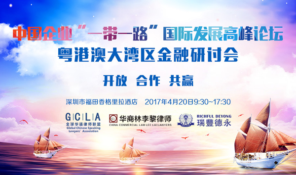 2017中國企業(yè)“一帶一路”國際發(fā)展高峰論壇暨粵港澳大灣區(qū)金融研討會,由全球華語律師聯(lián)盟、華商林李黎(前海)聯(lián)營律師事務(wù)所及瑞豐德永集團(tuán)聯(lián)合主辦,深圳市對外貿(mào)易企業(yè)發(fā)展促進(jìn)會、深圳市國際投資促進(jìn)中心、深圳市前海企業(yè)服務(wù)有限公司、深圳市電子商務(wù)協(xié)會共同協(xié)辦,深圳市前海香港商會作為支持單位,是首次以粵港澳大灣區(qū)金融發(fā)展為主題的國際性高峰論壇,將于2017年4月20日在中國深圳舉辦,特邀請您出席!