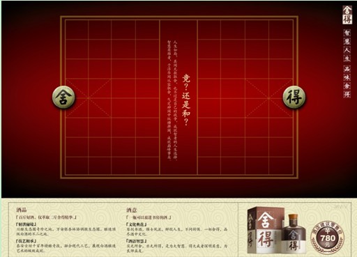 人們所常說,“民族的才是世界的”,這是因?yàn)橹挥芯哂凶约旱拿褡屣L(fēng)格特色,才能夠得到世界人民的喜愛,這其中也體現(xiàn)了共性與特性的矛盾的關(guān)系,如果一個(gè)品牌想打造成為國際品牌,卻放棄了其民族化的一面,刻意強(qiáng)調(diào)其國際化的品牌風(fēng)格,這就將造成品牌空洞化的毛病,反而缺乏個(gè)性,無法讓全世界的消費(fèi)者記住這個(gè)品牌。舍得酒在保持民族性方面就做的非常到位,品牌廣告訴求、品牌氣質(zhì)的把握非常精準(zhǔn)。僅從包裝而言,具有厚重的中國傳統(tǒng)文化氣質(zhì),其黑白相間的盒體包裝正暗合了“天與地”“陰和陽”“上與下”“左和右”……等和諧相生的統(tǒng)一,格調(diào)雅致,別有風(fēng)味更顯得平靜和理性。整個(gè)瓶體和包裝造型無不透出中國陰陽兩極相生的哲學(xué)智慧,米字格中顏體“舍得”二字,融入中國的書法文化,更加凸顯了舍得酒的中國傳統(tǒng)文化氣質(zhì)。