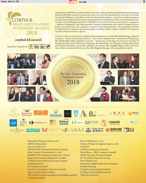 香港《星島日報》在2018年3月19日刊載2018年度杰出企業(yè)得獎名單
