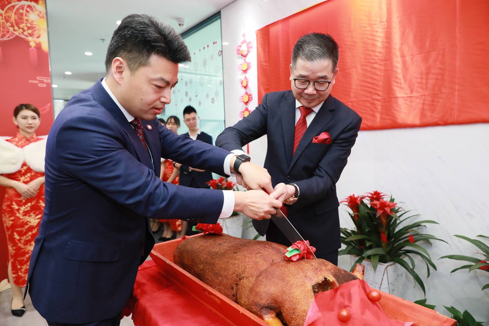 張海亮先生共切象征吉祥如意的烤乳豬,寓意紅紅火火,財源廣進(jìn)