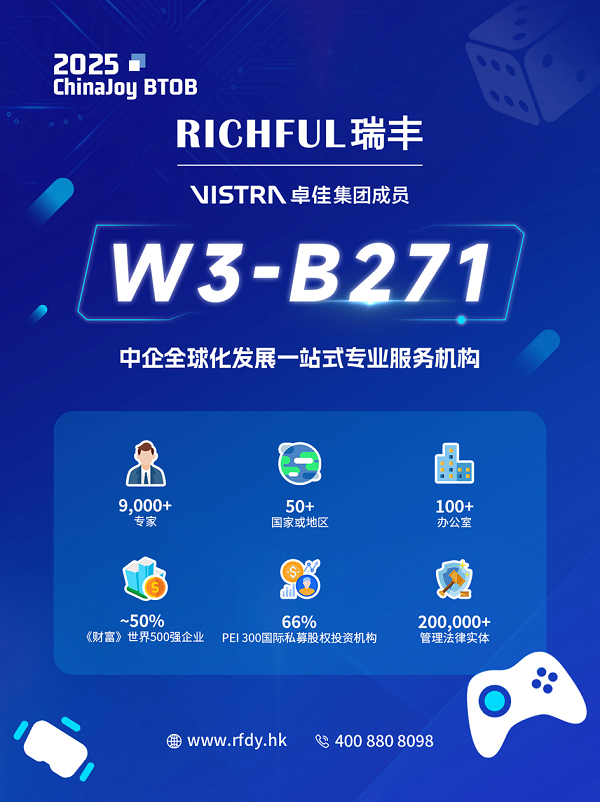 ChinaJoy作為中國(guó)乃至全球數(shù)字娛樂產(chǎn)業(yè)的風(fēng)向標(biāo),是連接國(guó)內(nèi)外游戲企業(yè)、探索合作機(jī)遇的頂級(jí)平臺(tái)。RICHFUL瑞豐深刻理解中國(guó)游戲企業(yè)在“走出去”過程中面臨的合規(guī)、財(cái)稅、運(yùn)營(yíng)、架構(gòu)搭建等復(fù)雜挑戰(zhàn)。我們參展ChinaJoy BTOB,正是為了深度參與這場(chǎng)游戲盛會(huì),與優(yōu)秀的中國(guó)游戲開發(fā)者、發(fā)行商、平臺(tái)方和投資機(jī)構(gòu)面對(duì)面交流,分享我們?cè)谥С制髽I(yè)全球化方面的專業(yè)經(jīng)驗(yàn),特別是針對(duì)游戲出海的關(guān)鍵環(huán)節(jié)。
