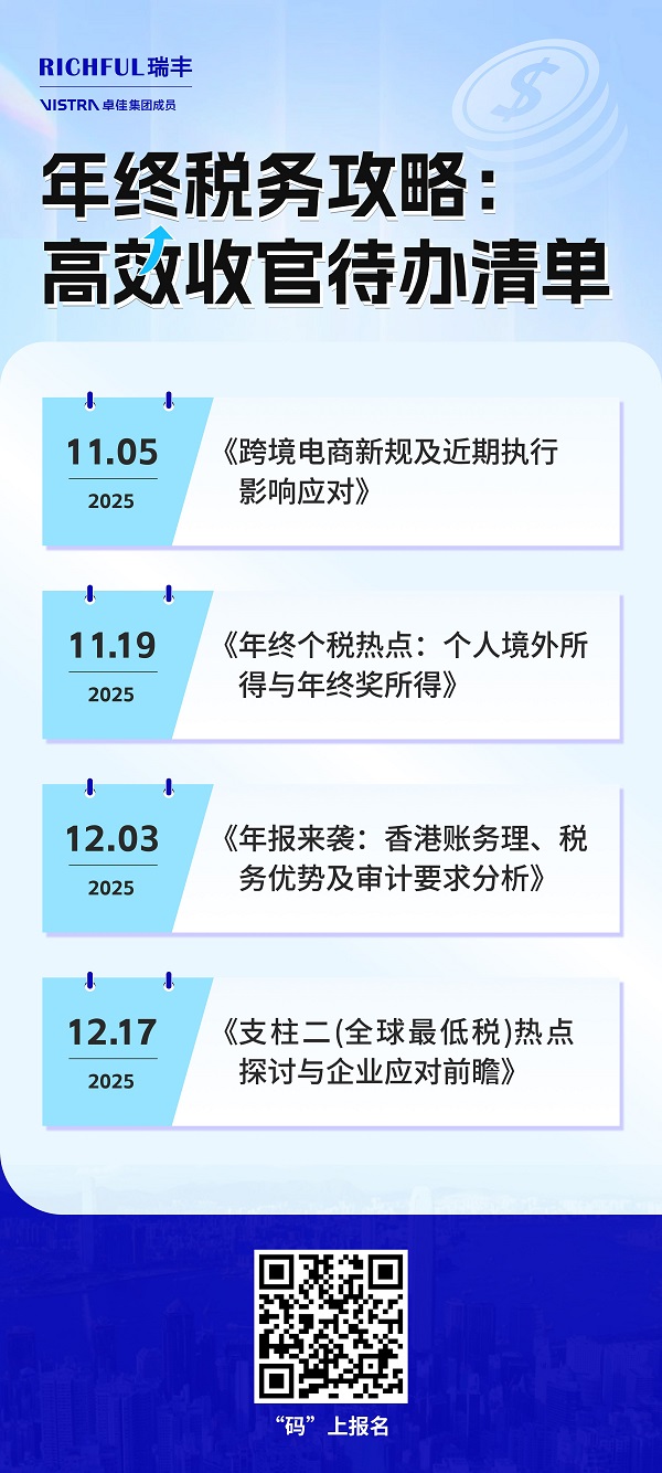 歲末將至,面對紛繁復雜的稅務(wù)政策與緊迫的年度收官工作,您是否正在尋求一份清晰高效的行動指南?我們精心策劃 “年終稅務(wù)攻略:高效收官待辦清單”系列網(wǎng)絡(luò)研討會,直擊四大關(guān)鍵議題,助您系統(tǒng)梳理合規(guī)路徑,優(yōu)化財稅布局,為2025年的穩(wěn)健發(fā)展奠定堅實基礎(chǔ)。