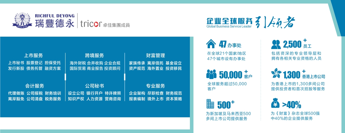 瑞豐德永(Richful Deyong)2008年始創(chuàng)于香港,系卓佳(Tricor)集團(tuán)成員,是亞洲具有領(lǐng)先地位的專業(yè)服務(wù)機(jī)構(gòu),在全球21個(gè)國(guó)家/地區(qū)47個(gè)城市設(shè)有辦事處,擁有2500多名員工,服務(wù)超過(guò)30000客戶,1300間香港聯(lián)交所上市公司,500間新加坡和馬來(lái)西亞上市公司,名列財(cái)富雜志500強(qiáng)企業(yè)超40%及眾多跨國(guó)知名公司。