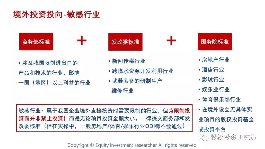 1.敏感行業(yè):屬于我國企業(yè)境外直接投資時需要限制的行業(yè),但為限制投資而并非禁止投資!而是無論項目投資金額大小,一律提交商務部和發(fā)改委核準(但在實操中,一般房地產/體育/娛樂行業(yè)ODI都不會通過)