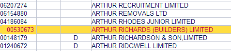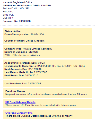 您可以在Company Name后的空格內(nèi)輸入您要查找的公司名,如:ARTHUR RICHARDS (BUILDERS) LIMITED,然后點擊 SEARCH,您便可以看到以下內(nèi)容 (圖示2):