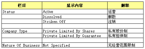 從這個頁面上您可以看到公司的名稱和注冊地址(Name & Registered Office), 公司的注冊號碼(Company No.),公司狀態(tài)(Status),成立時間(Date of Incorporation),公司類型(Company Type),公司營業(yè)性質(zhì)(Nature of Business),報稅日期(Next Accounts Due),年審日期(Next Return Due)。