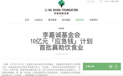 同一天,李嘉誠基金會(huì)發(fā)布聲明:香港現(xiàn)正面對前所未有的挑戰(zhàn),為解飽受打擊的中小企燃眉之急,基金會(huì)此前宣布捐款10億元“應(yīng)急錢”。