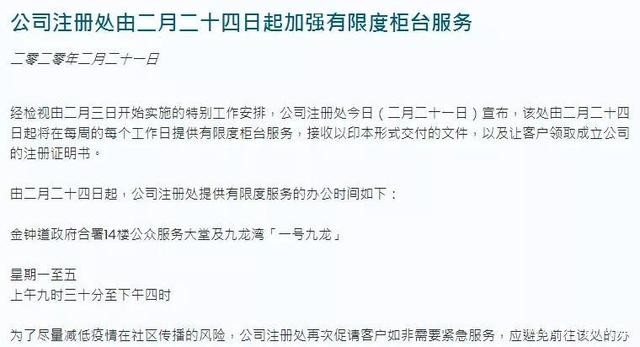 香港公司注冊處發(fā)布新聞公報(bào)宣布,由2月24日起繼續(xù)提供有限度柜臺(tái)服務(wù);僅接受影印文件提交,及辦理客戶領(lǐng)取成立公司注冊證明書 。