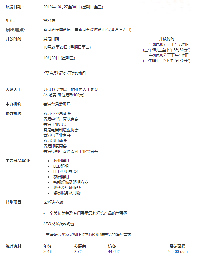 香港國際秋季燈飾展2019(秋季展)提供絕佳的展示平臺,讓各式各樣照明產(chǎn)品供應(yīng)商直接聯(lián)系國際買家。秋燈展與香港貿(mào)發(fā)局香港國際戶外及科技照明博覽皆由香港貿(mào)發(fā)局主辦,合組成全球最大的燈飾及照明產(chǎn)品商貿(mào)平臺。2018年秋燈展匯聚2700家來自37個國家及地區(qū)的參展商,與逾44600名買家洽商。