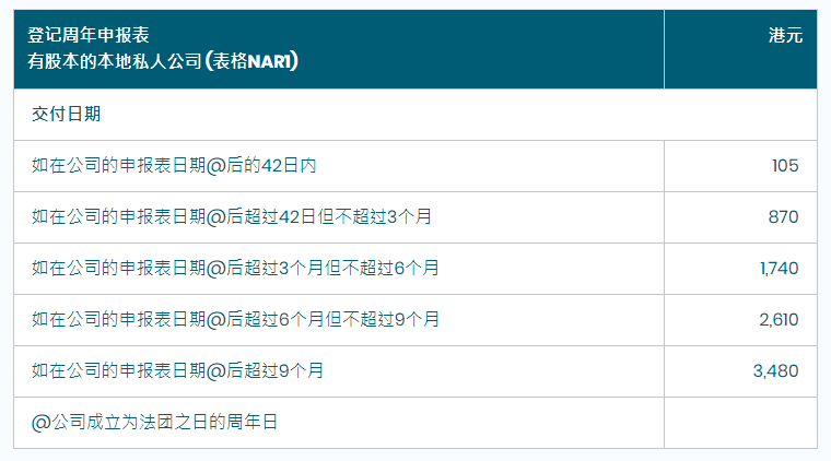 相關(guān)費(fèi)用:私人公司、擔(dān)保有限公司費(fèi)用為105港元,公眾公司為140港元。若逾期遞交,則按5個(gè)梯度進(jìn)行罰款,即實(shí)施較高的登記費(fèi)。