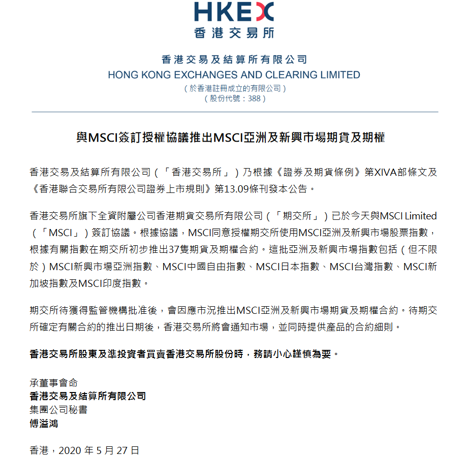 5月27日,港交所與MSCI簽訂協(xié)議,獲得未來10年授權(quán)在香港推出系列MSCI亞洲和新興市場(chǎng)指數(shù)的期貨及期權(quán)產(chǎn)品。根據(jù)協(xié)議,MSCI同意授權(quán)期交所使用MSCI亞洲及新興市場(chǎng)股票指數(shù),根據(jù)有關(guān)指數(shù)在期交所初步推出37只期貨及期權(quán)合約。
