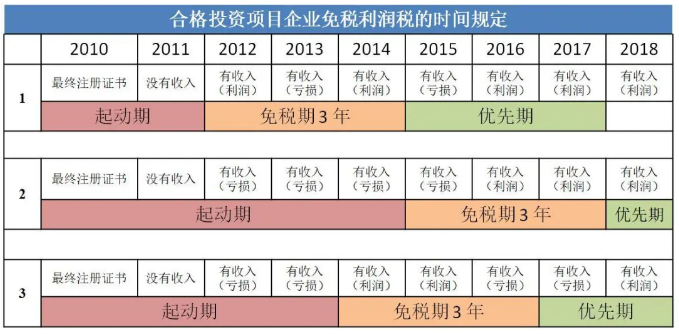 免繳企業(yè)所得稅:免稅期由起動(dòng)期3年+免稅期3年+優(yōu)先期3年構(gòu)成(最多9年)