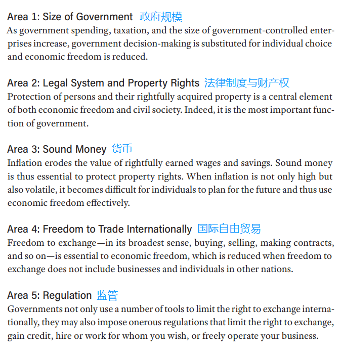 自1996年起,菲沙研究所每年均會發(fā)表世界經(jīng)濟(jì)自由度報告,最新報告中涉及5大評估標(biāo)準(zhǔn),包括政府規(guī)模、法律制度和財產(chǎn)權(quán)、貨幣、國際貿(mào)易自由、監(jiān)管。