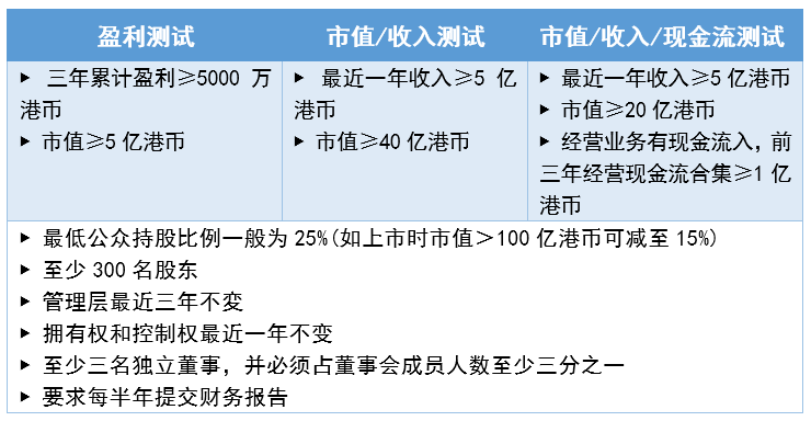 企業(yè)想在港交所上市,必須得提供足夠的財務信息給港交所審核。例如,想要在港交所主板上市,需要通過港交所的三套財務測試(盈利測試、市值/收入測試、市值/收入/現(xiàn)金流測試)標準中的至少一個: