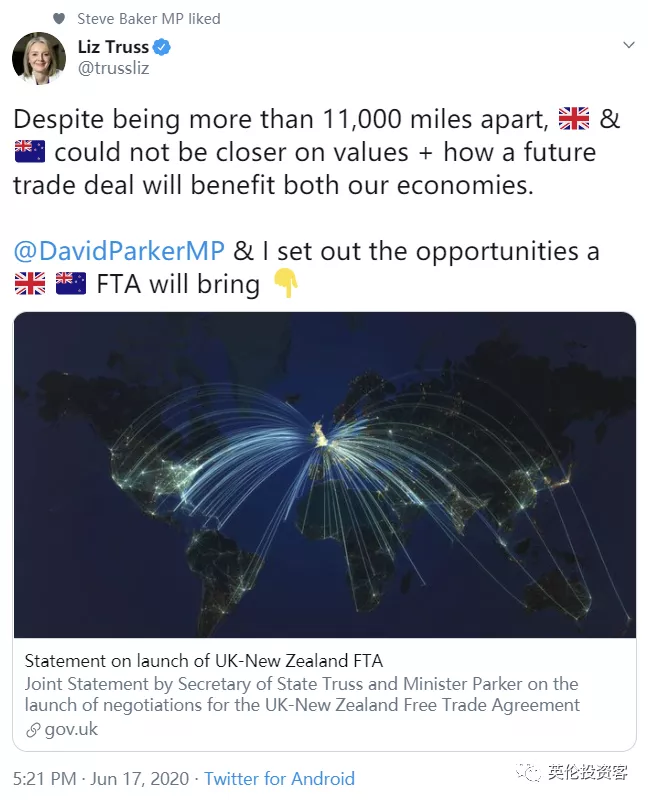 國(guó)際貿(mào)易大臣Liz Truss也在個(gè)人推特上發(fā)布了談判最新動(dòng)態(tài)。