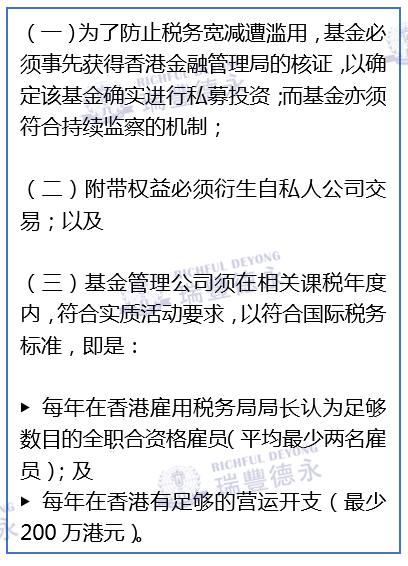 目前為了進一步香港鞏固香港私募基金樞紐的優(yōu)勢,特區(qū)政府立法會將實施當初承諾的第二步驟:為在香港營運的私募基金所分發(fā)的「附帶權益」提供稅務寬減。但有關附帶權益必須符合若干條件,方可獲得稅務寬減,其中包括:
