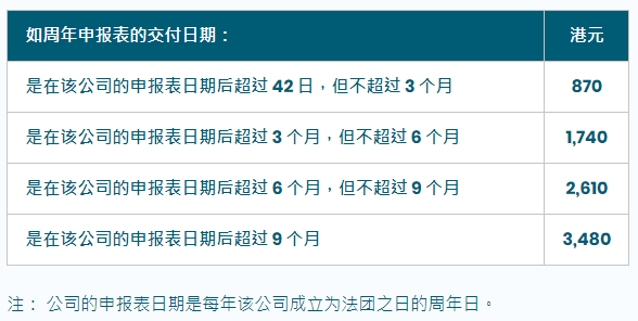 逾期交付周年申報表的公司,須繳付較高的登記費用,相當(dāng)于罰款,根據(jù)不同類型罰款也略有不同,以本地私人公司逾期交付周年申報表為例,逾期繳付的登記費用如下: