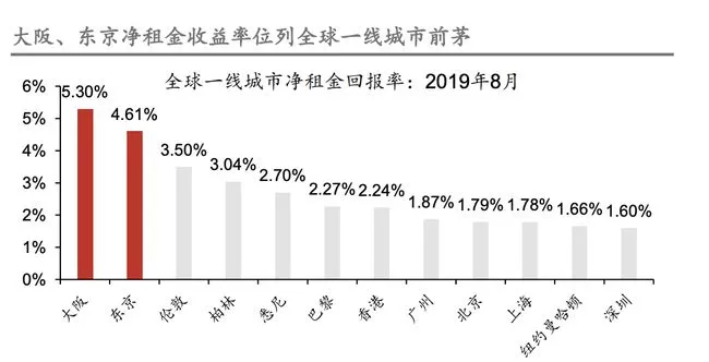 從投資門檻上來看,日本110多萬就可以入手東京地標(biāo)位置的新建酒店;從投資回報(bào)率上來看,日本不動(dòng)產(chǎn)研究院公布的一份2019年8月的數(shù)據(jù)報(bào)告顯示,在全球眾多熱門城市中,大阪凈租金收益率以5.30%遙遙領(lǐng)先于其他國際城市,東京排名第二,凈收益可達(dá)4.61%。