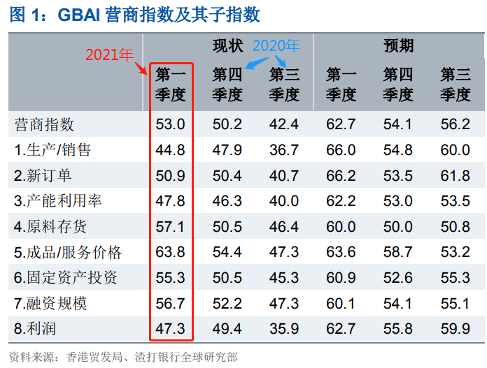 從指數(shù)看,GBAI 的經(jīng)營活動的“現(xiàn)狀”指數(shù)從2020年第四季度的50.2連續(xù)第三個季度上升至2021年第一季度的53.0,高于中性值 50,代表2021年第一季度營商信心開局強勁。