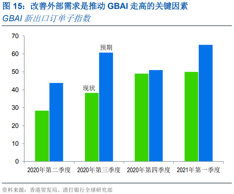 全球通貨再膨脹背景,尤其是在疫苗的迅速推廣以及美國即將出臺的新一輪財政刺激計劃的推動下,幫助提升新了企業(yè)出口訂單的前景,在國內(nèi)強勁復蘇的同時,提振大灣區(qū)表現(xiàn)突出的制造業(yè)(圖 15)。