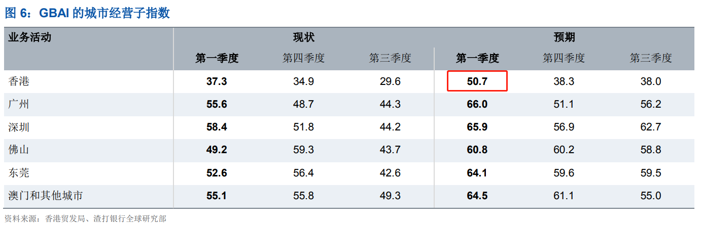 而香港終于表現(xiàn)出開始改善的跡象,盡管當前仍是大灣區(qū)表現(xiàn)較為落后,業(yè)務(wù)活動現(xiàn)狀指數(shù)連續(xù)第四個季度低 40,但其預(yù)期指數(shù)從之前的 38.3 躍升至 50.7,與經(jīng)濟增長相一致。種種跡象表示,香港經(jīng)濟正在復蘇。