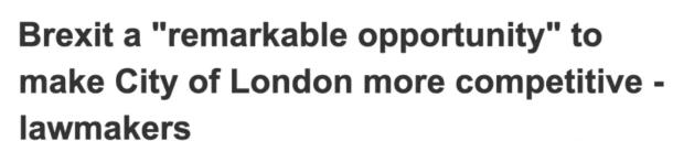 而英國(guó)路透社報(bào)道近日指出,“英國(guó)脫歐,將成為倫敦金融城更具競(jìng)爭(zhēng)力的千載難逢機(jī)遇。”
