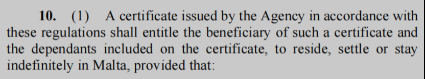 法案中明確提到身份局簽發(fā)的身份紙可以讓申請人及其附屬申請人無限期地在馬耳他居住、定居及生活。身份局通過法案的形式進(jìn)一步明確了馬耳他身份的永居屬性。