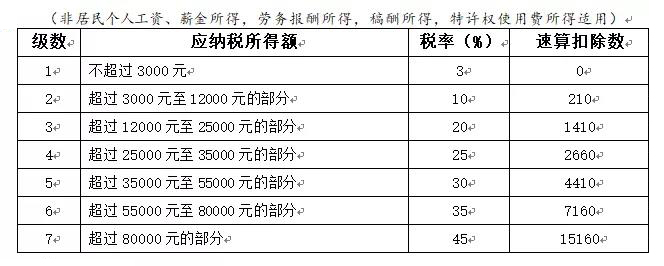 2.非居民個人取得工資、薪金所得;勞務(wù)報酬所得;稿酬所得和特許權(quán)使用費所得,依照本表按月?lián)Q算后計算應納稅額。