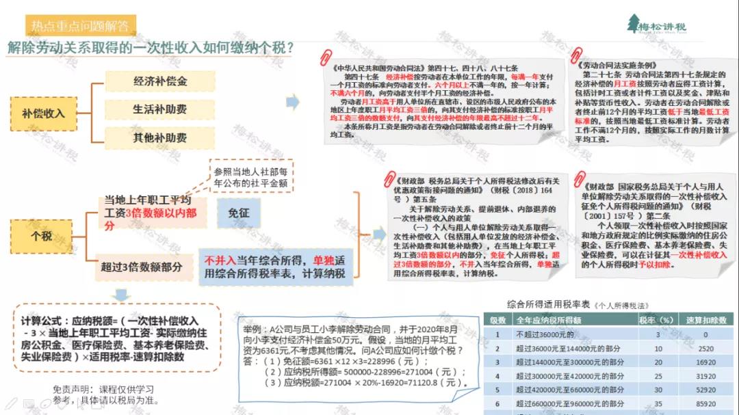 財稅【2018】164號第五條第一項:個人與用人單位解除勞動關(guān)系取得一次性補償收入(包括用人單位發(fā)放的經(jīng)濟補償金、生活補助費和其他補助費),在當?shù)厣夏曷毠て骄べY3倍數(shù)額以內(nèi)的部分,免征個人所得稅;超過3倍數(shù)額的部分,不并入當年綜合所得,單獨適用綜合所得稅率表,計算納稅。