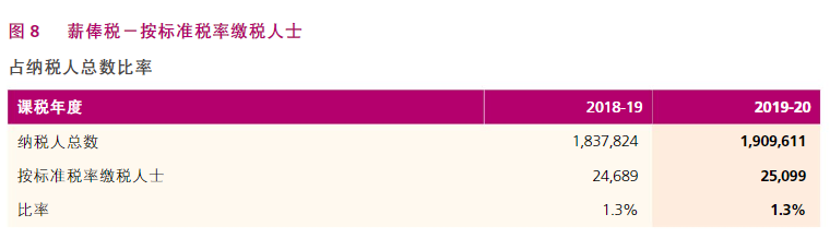 2019-20課稅年度按標(biāo)準(zhǔn)稅率繳稅的人士有25,099名,較上年度增加了410名。在薪俸稅最后評(píng)稅總額中,按標(biāo)準(zhǔn)稅率繳稅的人士佔(zhàn)35.7%,較上年度下跌1.9%。