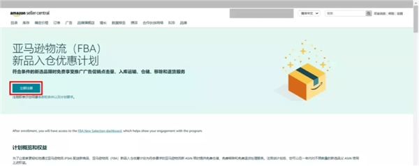 (1)登陸亞馬遜賣家平臺(tái),訪問(wèn)該計(jì)劃活動(dòng)頁(yè),點(diǎn)擊頁(yè)面中的“立即注冊(cè)”按鈕,即可加入該計(jì)劃。您發(fā)送商品到亞馬遜運(yùn)營(yíng)中心之前,必須先注冊(cè)該計(jì)劃,才有機(jī)會(huì)享受計(jì)劃中的費(fèi)用優(yōu)惠。