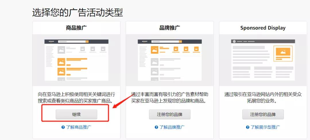 第三步:在新建廣告活動(dòng)頁(yè)面,選擇商品推廣方式底下的【繼續(xù)】,進(jìn)入新建廣告活動(dòng)頁(yè)面。