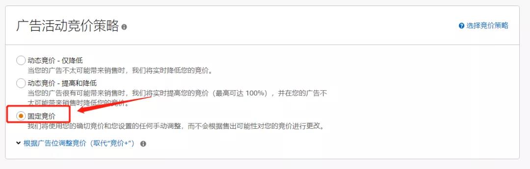 第五步:在【廣告活動(dòng)競(jìng)價(jià)策略】中,按照自己的商品投放要求進(jìn)行設(shè)置競(jìng)價(jià)方式,新品的話建議是【固定競(jìng)價(jià)】。