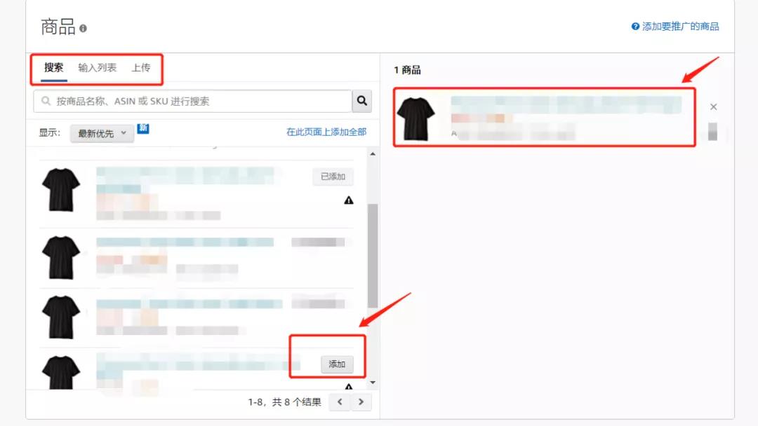 ①搜索:直接在搜索框中輸入商品名稱(chēng)、ASIN、SKU,搜索出需要投放的商品,點(diǎn)擊商品右邊的【添加】即可。