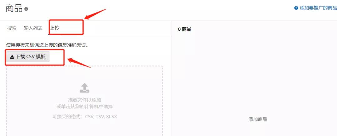 ③上傳:先下載CSV模板,得到一個(gè)EXCEL表格,按照表格中的提示輸入ASIN,并進(jìn)行上傳CSV模板。