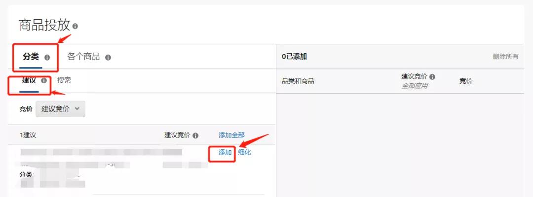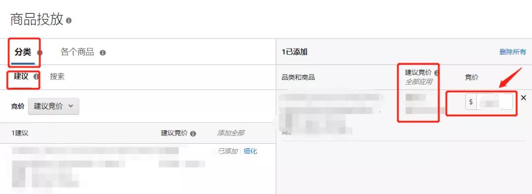 ①分類(lèi):在“分類(lèi)”選項(xiàng)卡中,您可以根據(jù)與商品的相關(guān)性投放相應(yīng)的推薦品類(lèi)。按照建議競(jìng)價(jià),設(shè)置合理的價(jià)格。