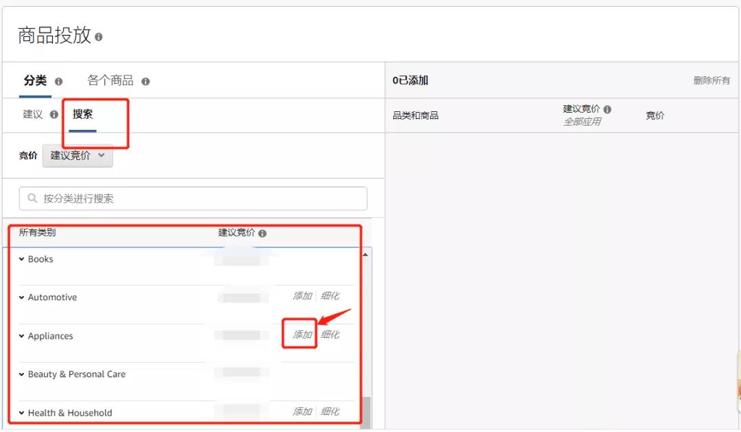 您也可以按照搜索方式,選擇“搜索”字段下方列出的品類(lèi),進(jìn)行添加,設(shè)置合適的出價(jià)。