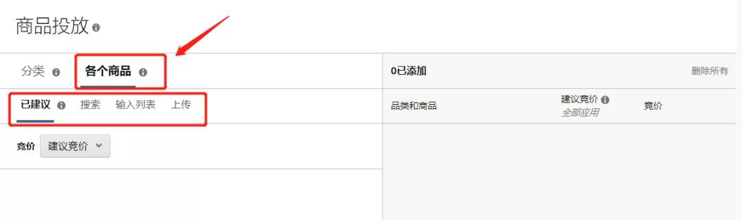 ②各個(gè)商品:在“各個(gè)商品”選項(xiàng)卡中,您可以投放與您廣告中的商品類(lèi)似的推薦商品。您還可以在“搜索”字段中搜索特定商品。