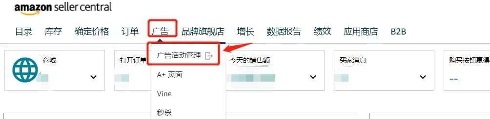 第一步:打開(kāi)亞馬遜賣(mài)家后臺(tái),找到工具欄中的【廣告】——【廣告活動(dòng)管理】。