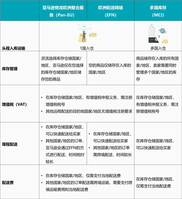 當您注冊并上傳了更多歐洲國家的VAT稅號時,您可以根據(jù)自身需求,選擇使用亞馬遜物流歐洲整合服務(wù)(Pan-EU)和/或多國庫存(MCI)。下圖將這三種配送方式進行簡單對比,供您參考。