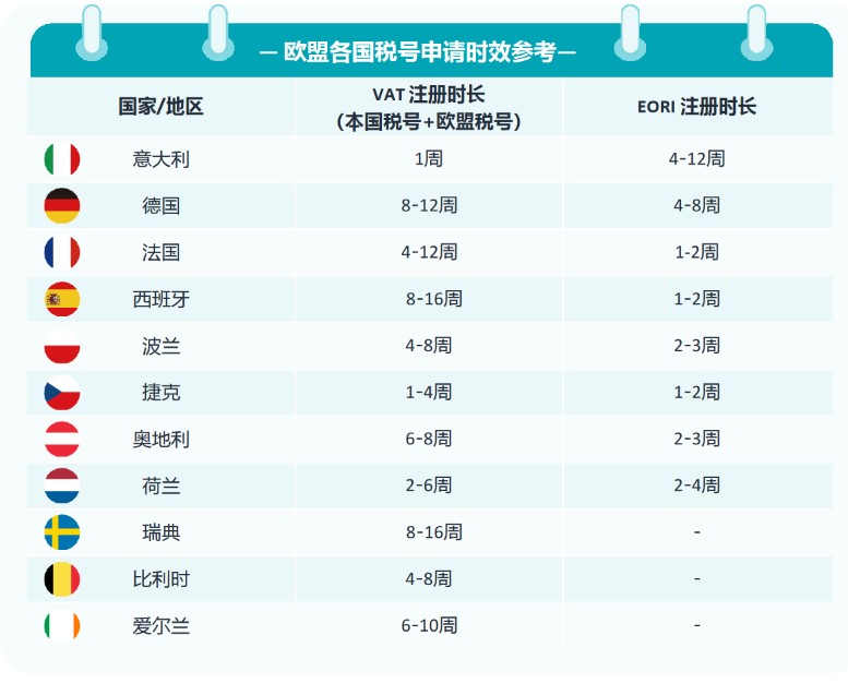 答:歐盟各國增值稅稅號(hào)注冊(cè)時(shí)長不一(請(qǐng)見下方“歐盟各國稅號(hào)申請(qǐng)時(shí)效參考”)