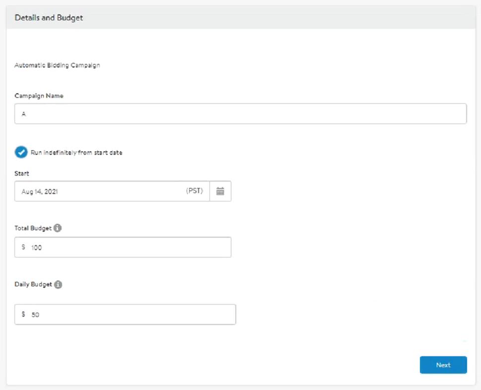 第 4 步:如圖4所示,輸入活動名稱并設(shè)置開始日期。你可以在此處選擇廣告的總預(yù)算以及每日預(yù)算。總預(yù)算必須至少為 100 美元,每日預(yù)算必須至少為 50 美元。