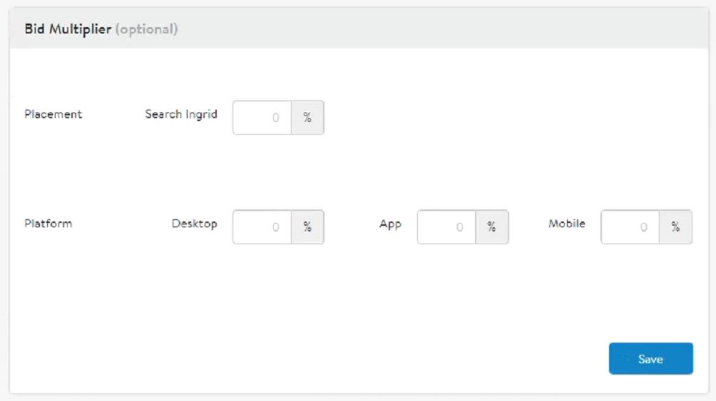 你可以選擇在購買按鈕(僅限自動廣告)和搜索展示位置上設(shè)置出價乘數(shù)。此外,你可以選擇你的Walmart廣告顯示在桌面設(shè)備還是移動設(shè)備(App or Mobile)上。