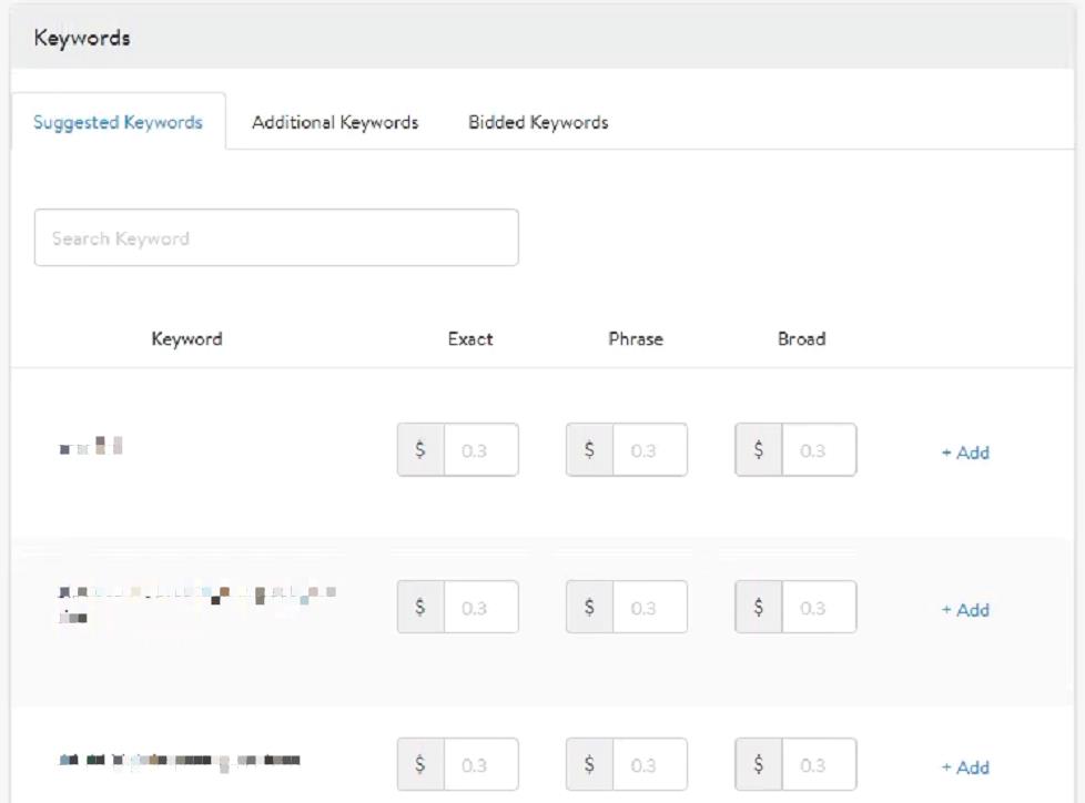 ②選擇自己的關(guān)鍵字并為每個關(guān)鍵字選擇匹配類型(完全匹配、詞組匹配或廣泛匹配)