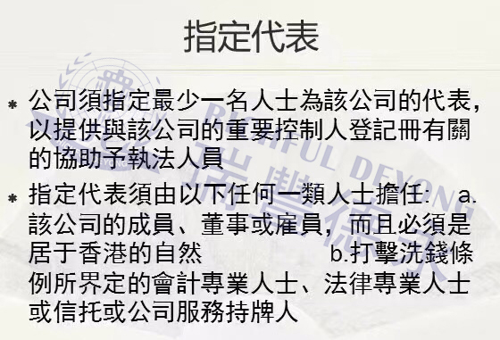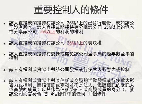 這里需要重點關(guān)注一下“公司指定代表”的幾個重要條件,現(xiàn)在市場很多小的香港公司注冊中介和代理可能無法達(dá)到上述要求,因此在辦理“備存重要控制人登記冊”的時候,一定要找符合條件和資質(zhì)的機構(gòu)來做,否則可能出現(xiàn)錢花了事情未辦妥的情況。