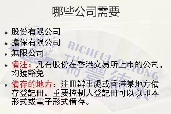 具體規(guī)定:所有在香港成立的公司都需要對重要控制人進行登記在冊,登記在冊事項內(nèi)容必須建冊并存于注冊辦理處地址或者香港指定地址,政府執(zhí)法人員將隨時進行查閱。