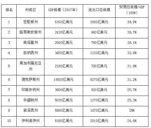 從百分比來看,密歇根州最為依賴國際貿(mào)易,其對外貿(mào)易規(guī)模在GDP中的占比達到了38.9%。