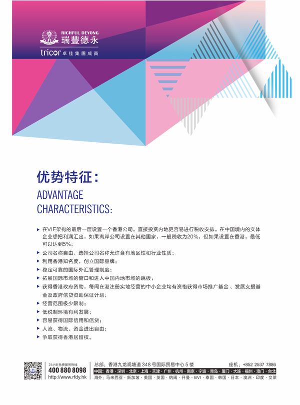 5、香港公司稅率低、稅種少,一般公司只涉及利得稅,稅率更低至16.5%;更重要的是利得稅是以利潤來源地劃分收入,只有在香港產(chǎn)生或取得(即源于香港)的利潤才須征收利得稅,對不來源于香港的利潤就算將貨款匯入香港也無須征稅,但需向稅務(wù)局申請稅務(wù)豁免;進(jìn)口一般商品,也無須繳納關(guān)稅,低稅環(huán)境利于發(fā)展,國際許多機構(gòu)用香港的稅務(wù)優(yōu)勢達(dá)到合理節(jié)稅;