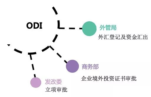 發(fā)改委核準(zhǔn)或備案→商務(wù)部核準(zhǔn)或備案→外匯管理局備案(銀行放外匯,外管局監(jiān)管)→實施ODI。